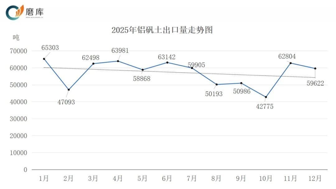 2025年全年铝矾土出口总量为687,170吨。1月为全年出口最高点,达65,303吨;2月回落至47,093吨;
