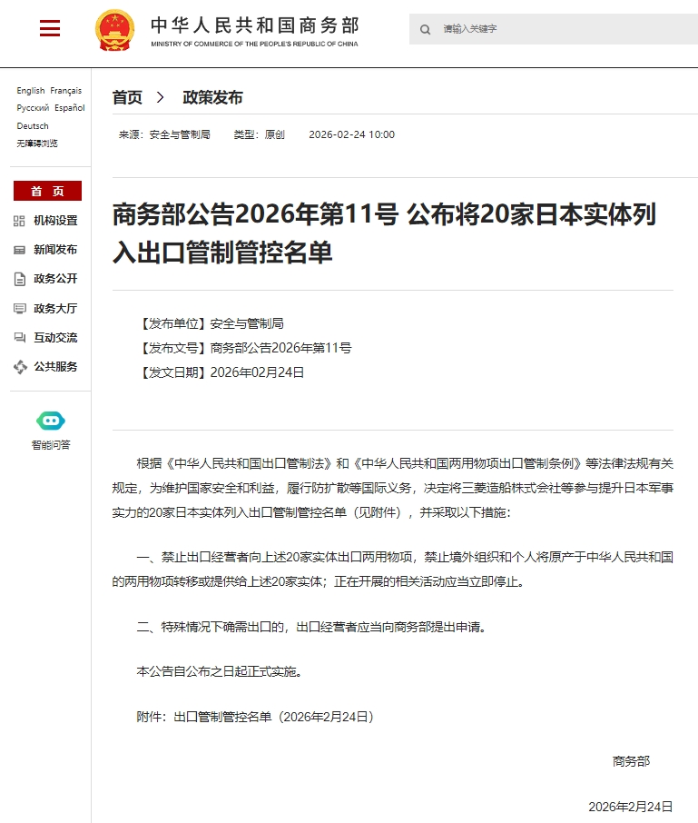2026年2月24日,商务部官网发布2026年第11号公告,宣布将20家日本实体列入出口管制管控名单。