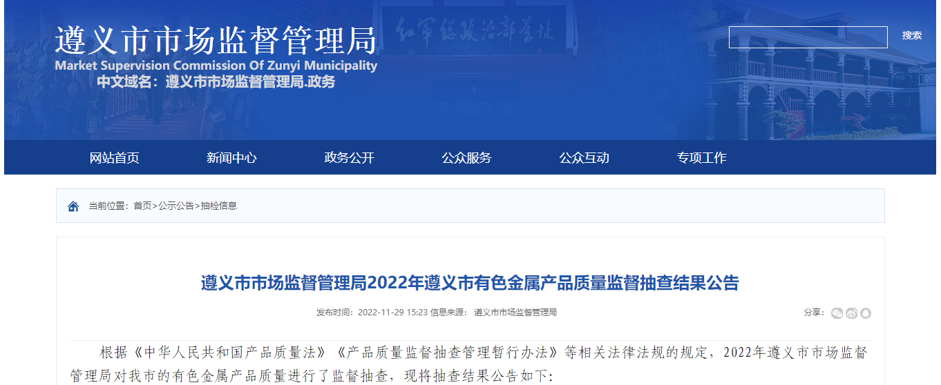 贵州省遵义市市场监管局抽检3批次有色金属产品合格率为100%