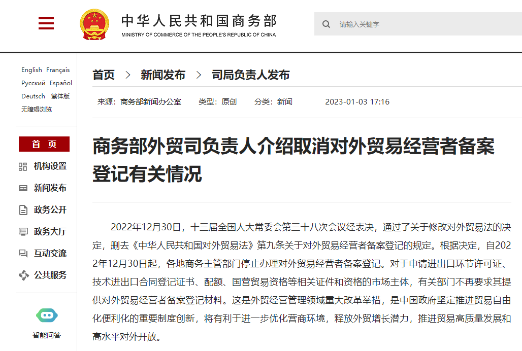1月3日,商务部发布消息,自2022年12月30日起,各地商务主管部门停止办理对外贸易经营者备案登记。对于申请进出口环节许可证、技术进出口合同登记证书、配额、国营贸易资格等相关证件和资格的市场主体,有关部门不再要求其提供对外贸易经营者备案登记材料。