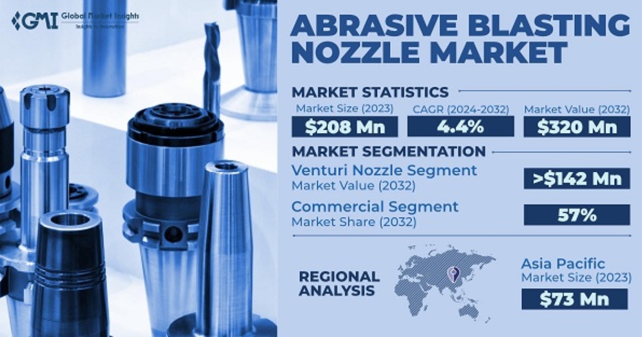 2023 年磨料喷砂喷嘴市场价值为 2.08 亿美元,预计 2024 年至 2032 年期间的复合年增长率为4.4%。